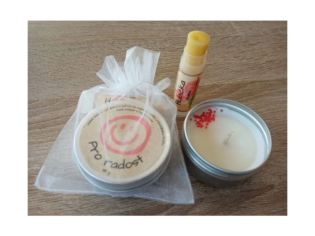 Roztomilé balení sójové svíčky a balzámu na rty.