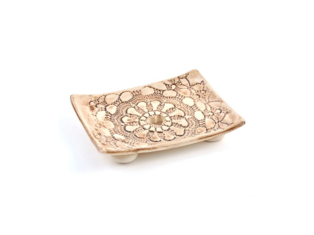 Tato podložka na mýdlo je ručně vyrobená z kvalitní keramiky s béžovou glazurou, zdobí ji vzor krajky. Vespod nechybí ani praktické nožky a uprostřed nezbytný otvor, kudy může přebytečná voda odtéct. Vaše oblíbené přírodní mýdlo nebo šampuk se tak rychleji vysuší a zůstane připraven na další použití.