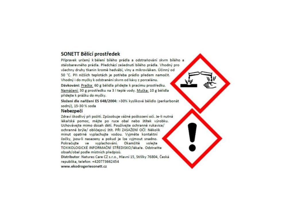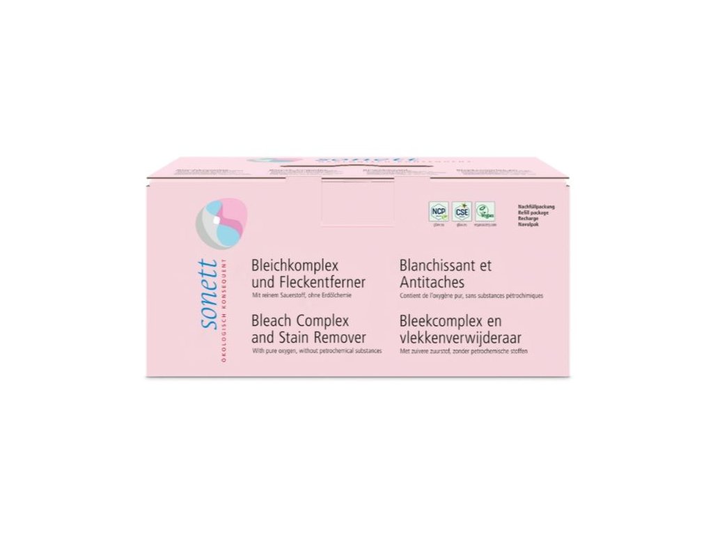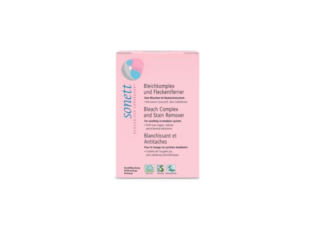 Šetrné bělení a odstraňování skvrn. Velmi účinný bělící prostředek a zároveň šetrný k tkaninám i životnímu prostředí. Třetí část modular systému SONETT K bělení bílého prádla, k odstraňování skvrn u bílého a stálobarevného prádla, k zjasnění zažloutlého a zašedlého prádla. Účinný již od 50°C. Vhodný pro bílé a stálobarevné prádlo z bavlny, lnu, konopí a smíšené tkaniny. Odstraňuje skvrny od ovoce, červeného vína, čaje, kávy, trávy, krve atd.
