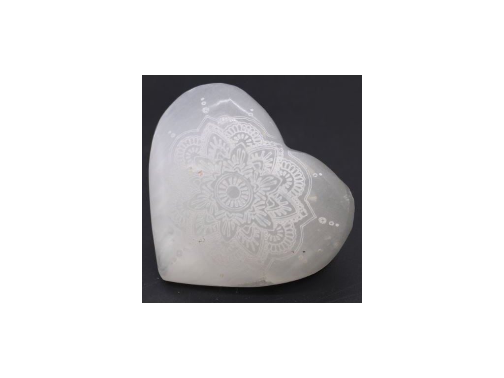 Toto perleťové srdce pochází ze selenitu z Maroka, kde je tento drahý kámen ručně opracován do požadovaného tvaru a gravírován motivem léčivé mandaly. Tak jako je každý kus selenitu jedinečný a originální, tak i každé selenitové srdce je jediné svého druhu.